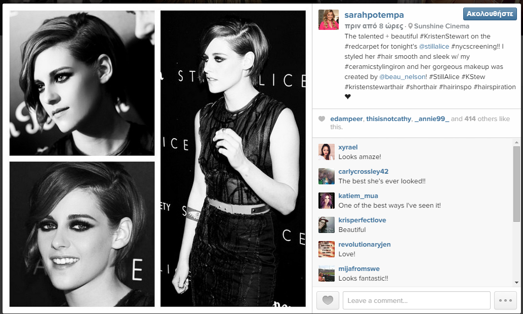 Tara Swennen (Estilista de Kristen), Beau Nelson (Maquillista de Kristen) y Sarah Potempa (Estilista de Peinado de Kristen) postean en Instagram sobre Kristen y su look el día de ayer.
